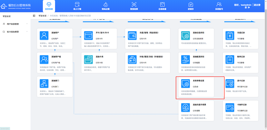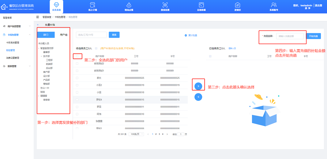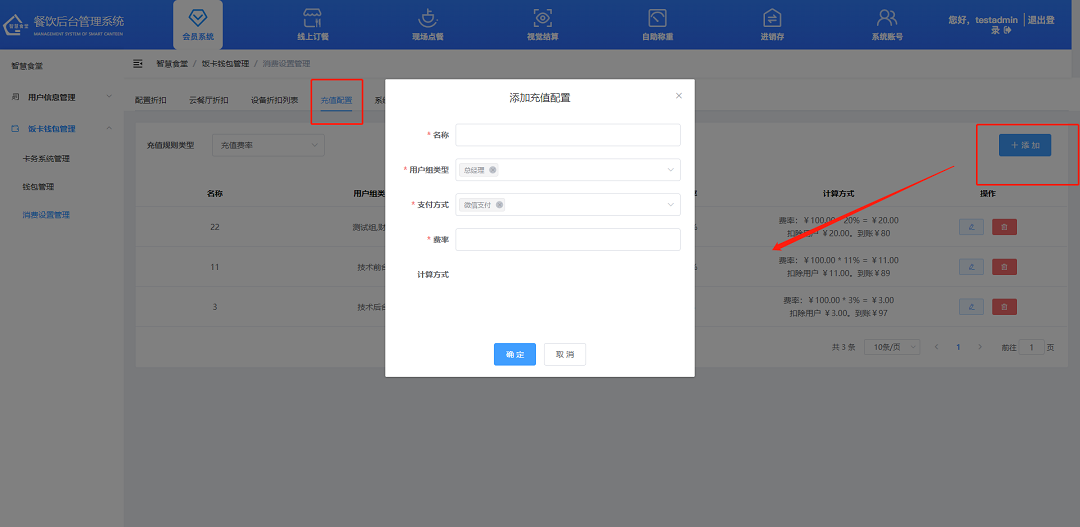 ①飯卡充值,點擊“充值”按鈕對用戶進行充值,填寫需充值的數額,選擇支付方式,點擊“確定”按鈕,完成充值;