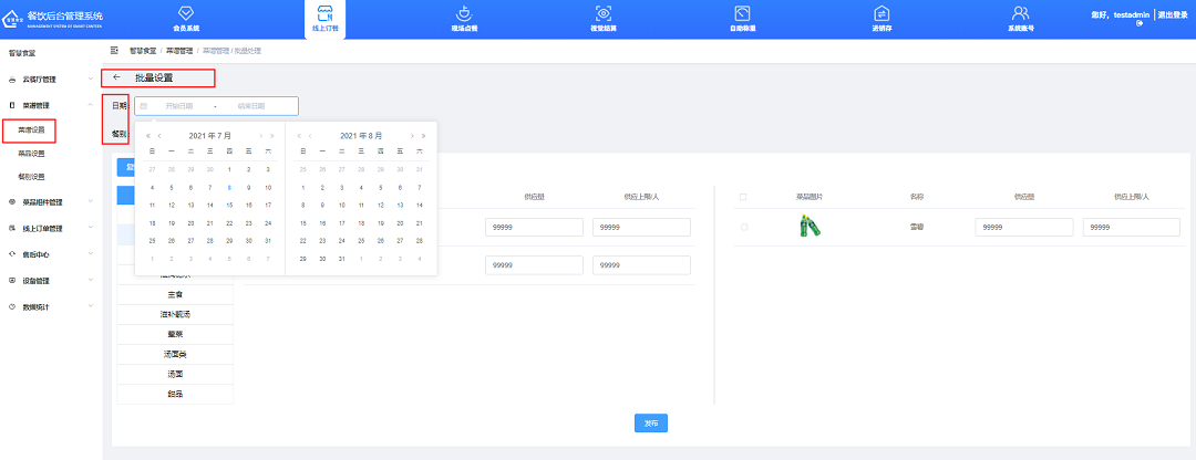 ①點擊“批量設置”按鈕,可進行批量排菜。例如:12月2號至6號(周一至周五)的晚餐,要排的菜都是相同的,就可使用此功能選擇對應日期段后批量發布。