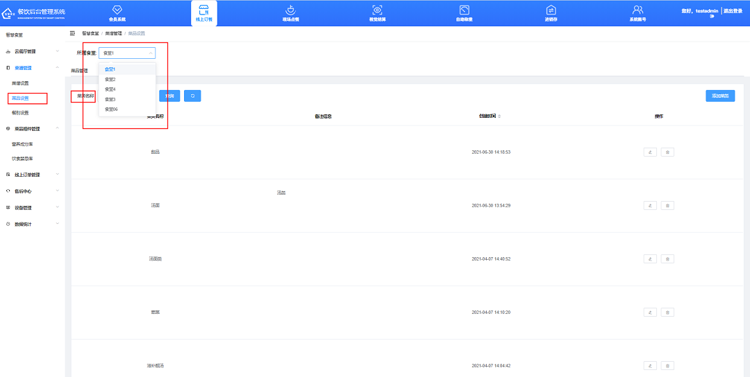 ①所屬食堂:可選擇查看不同食堂注冊的菜類列表。