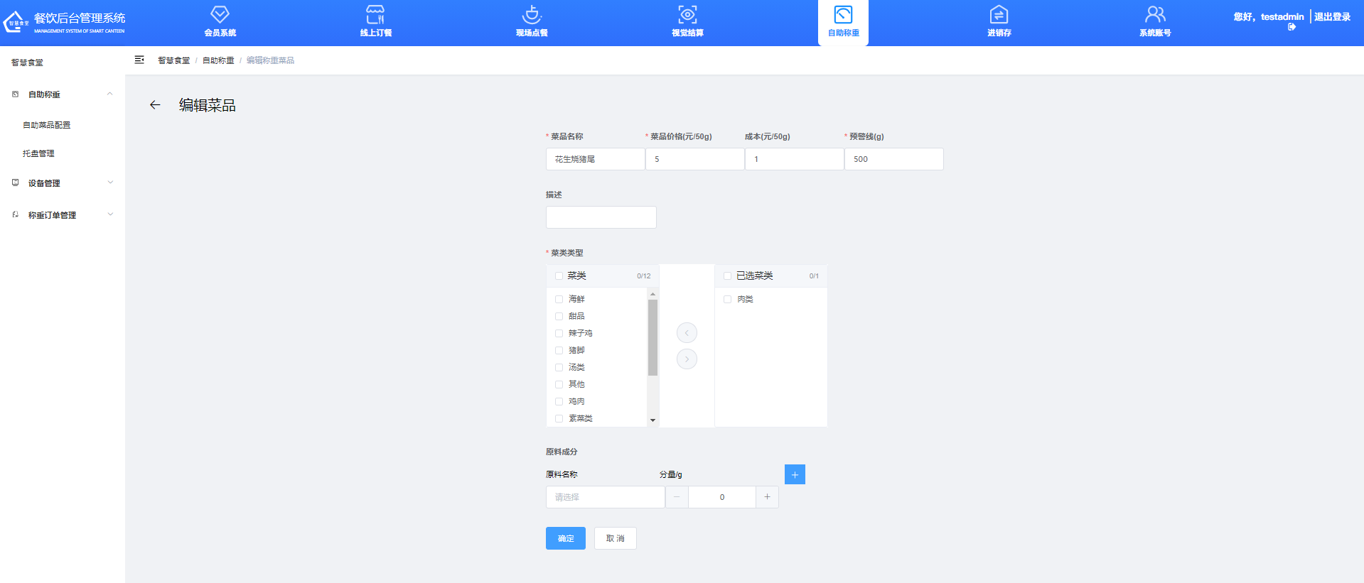 ②選擇計價方式,并輸入菜品名稱、菜品價格、菜品成本、預警線、描述等信息。③選擇菜品所屬的分類,選擇菜品搭配的配料。
