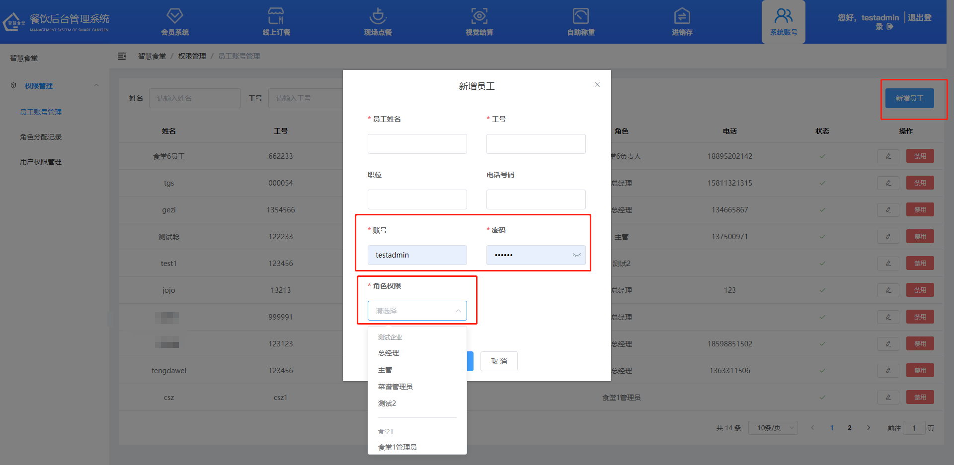 ②輸入員工姓名、工號(hào)、職位、電話(huà)號(hào)碼、賬號(hào)、密碼、角色權(quán)限等信息。