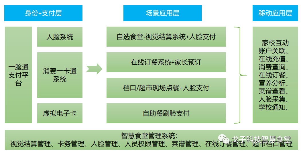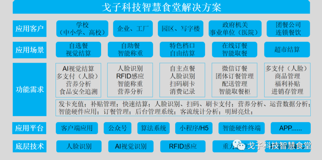 戈子科技結(jié)合高校、中小學(xué)等食堂實(shí)際運(yùn)營(yíng)場(chǎng)景以及學(xué)校、家長(zhǎng)、師生各方的實(shí)際需求,在整體智慧食堂解決方案背景下,打造了專(zhuān)注于學(xué)校智慧食堂場(chǎng)景的解決方案。